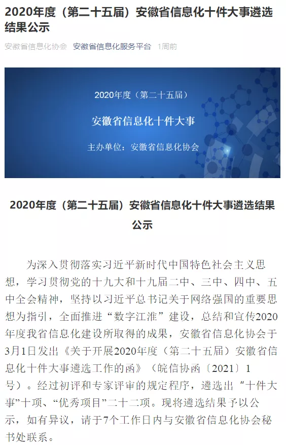 近日,安徽省信息化协会公示了2020年度(第二十五届)安徽省信息化十件大事遴选结果,中欧体育信息申报的“芜湖市信息资源安全治理项目”经过初评和专家评审,成功入选2020年度安徽省信息化十件大事,标志着我公司信息化建设再上新台阶。