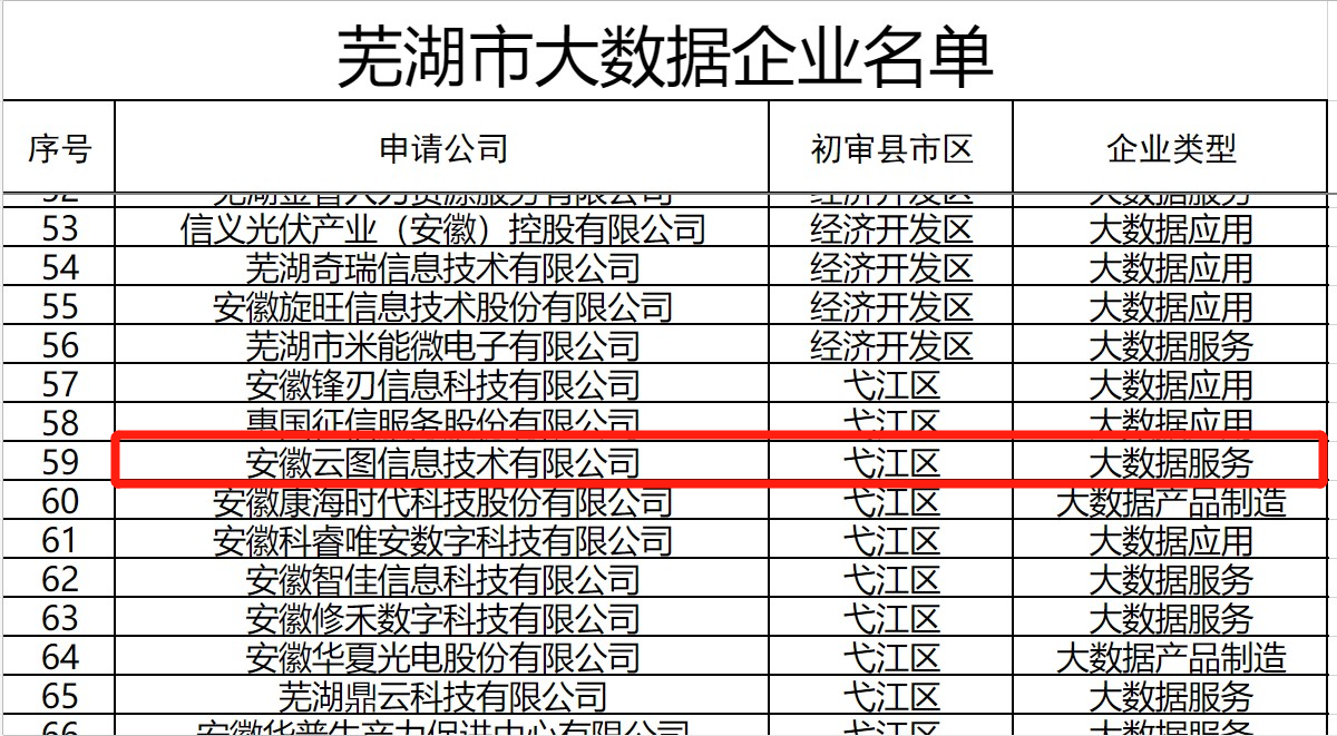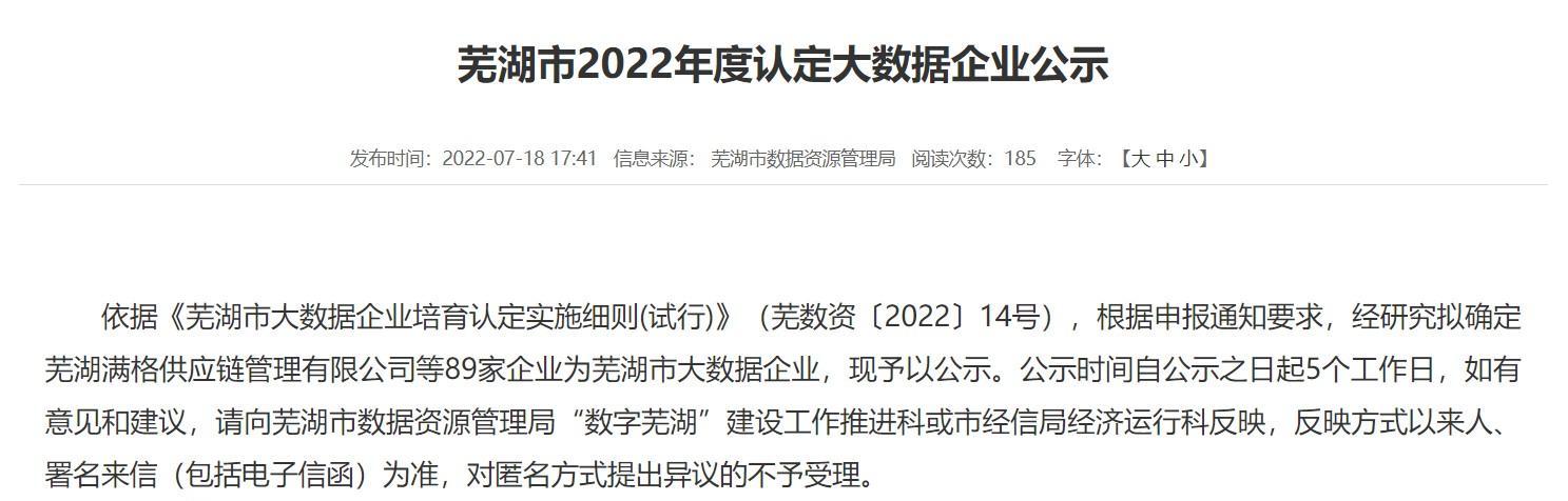 7月18日,芜湖市经信局公布了 2022年度芜湖市大数据企业认定名单,经过5天的公示期,安徽中欧体育信息技术有限公司等89家企业认定为2022年度芜湖市大数据企业。