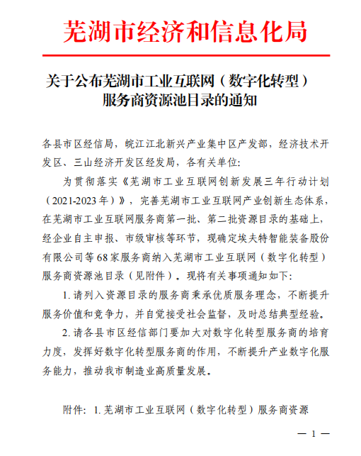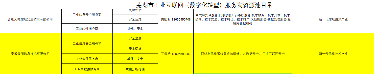 ? ? ? ? ? 近日,芜湖市经济和信息化局发布了关于公布芜湖市工业互联网(数字化转型)服务商资源池目录,安徽中欧体育成功入围了工业信息安全服务商、工业软件服务商、工业大数据服务商三大方向!