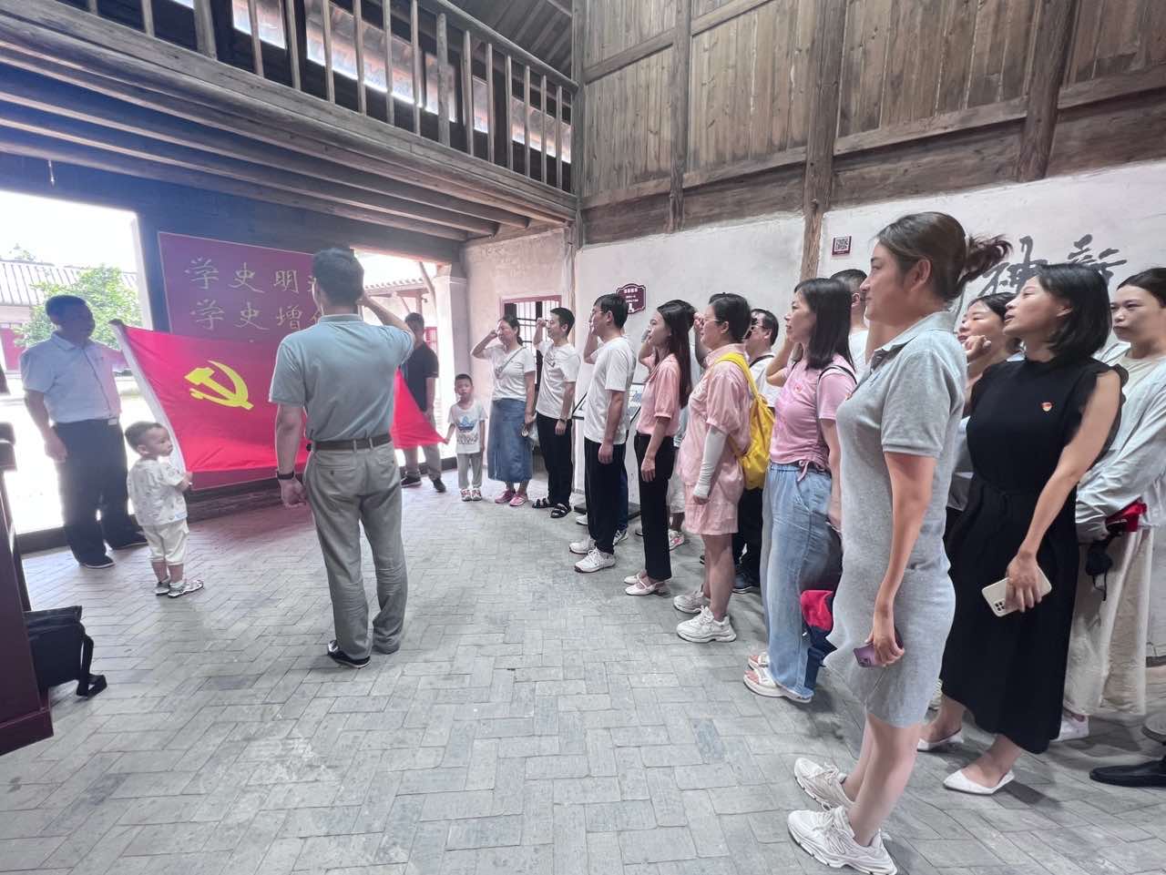 在白茆镇红色教育基地纪念馆里,中共安徽中欧体育支部和中共安徽商贸职业技术学院信息与人工智能学院党总支新老党员齐聚,面对党旗重温入党誓词,感悟初心使命,强化责任担当。