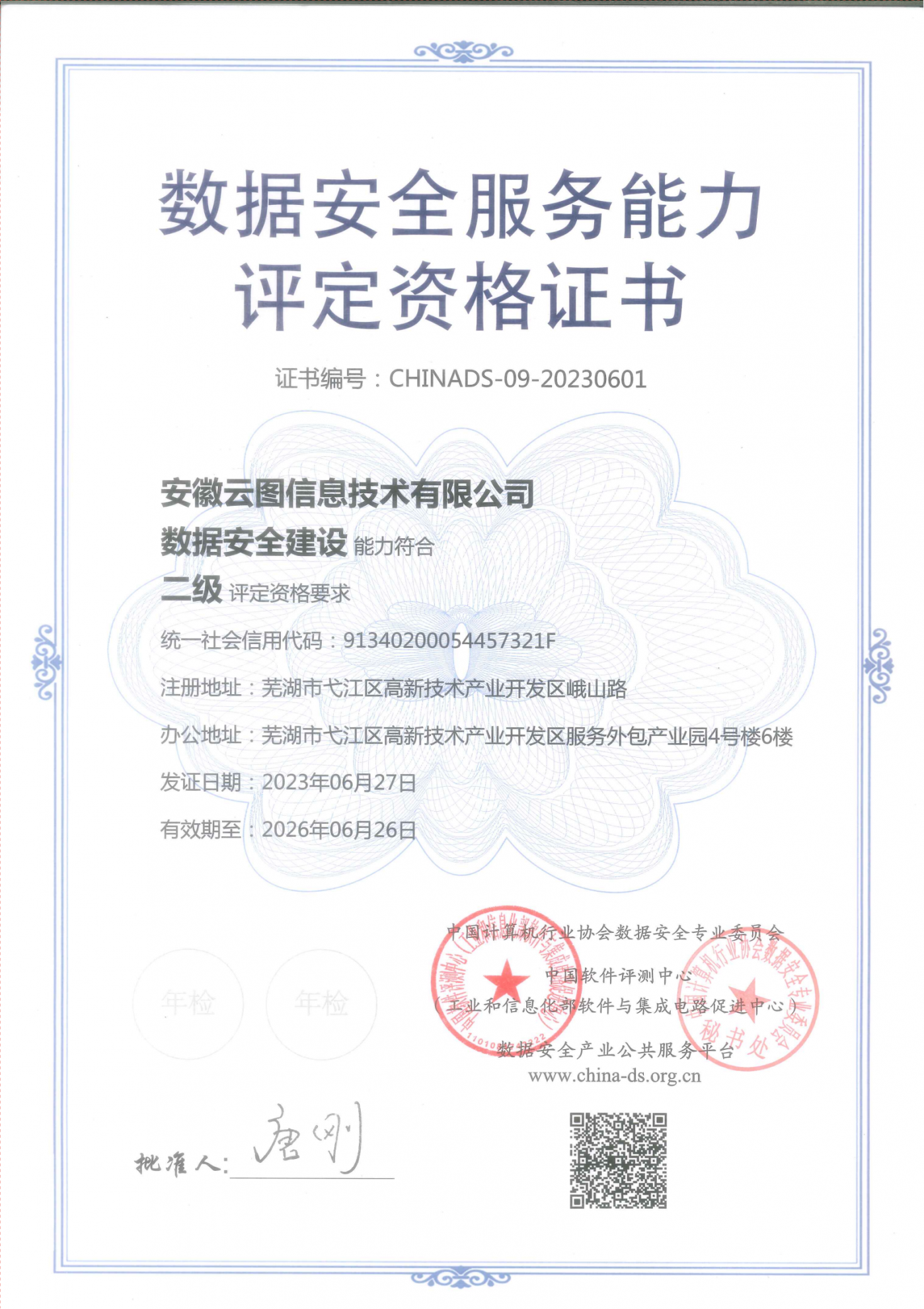 ? ? ? 安徽中欧体育以优异的成绩通过数据安全服务能力验证,获得数据安全建设能力二级(最高等级)资格证书,成为全国首批通过该项验证的机构之一。